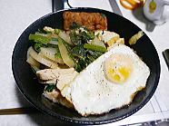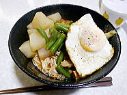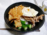 | 13時19分、昼食は肉炒め丼・目玉焼き乗せです。茹でキャベツ&オクラ、大根の唐辛子漬けが付け合わせ。ご馳走様でした。 |