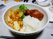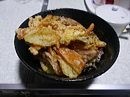 | 20時23分、晩ごはんは天麩羅 (野菜と煮干しと青汁粉) &鶏肉揚げの盛り合わせ丼です。ご馳走様でした。 |