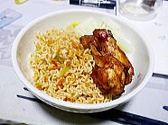 | 19時07分、晩ごはんはノンフライ麺の焼きそば風です。鶏肉と茹でたキャベツが付け合わせ。ご馳走様でした。 |