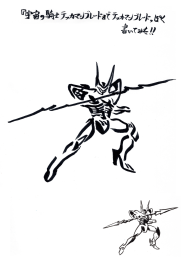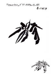 | イメージ習字は『マクロスプラス』 (シルエットモチーフはYF-19) のバトロイド形態と―― |