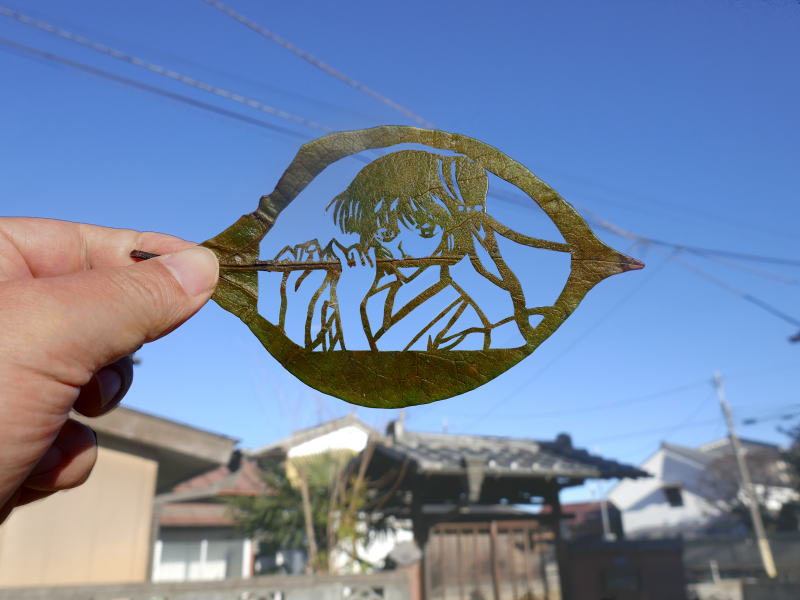 太い葉脈を笛に見立てて切っています。