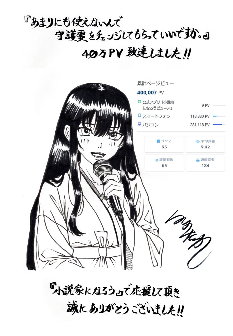 ●『あまりにも使えないんで守護霊をチェンジしてもいいですか。』の40万PV記念イラストです。(2026/01/21UP) 主人公の元・守護霊、今際乃真雨 (いまわの・まさめ) のカラオケシーンです。 『小説家になろう』で応援して頂き有難うございました! このページの先頭へ