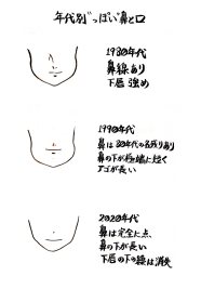 今朝の筆ペン落書きは、年代別の流行りの鼻と口唇のまとめです。