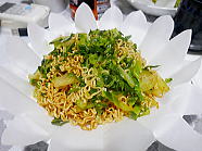 | 晩ごはんはノンフライ麺を焼きそばにしたものの鶏胸肉の味噌漬け炒めの土手囲いです。ご馳走様でした。 |