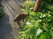 | 食後に仲良く庭に繰り出したミィミィとチャーとコロ。 |