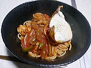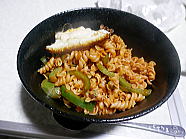 | 19時55分、晩ごはんはペンネをナポリタン風にして目玉焼きを乗せた物です。ご馳走様でした。 |