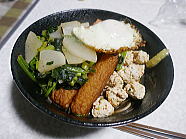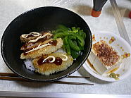 | 13時06分、昼食はコロッケ (冷凍食品) 丼です。茹でた鞘隠元 (冷凍) と目玉焼き、高菜漬けが付け合わせ。ご馳走様でした。 |