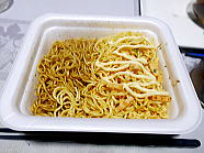 20時46分、晩ごはんはノンフライ麺の焼きそば風です。茹でた鶏団子&キャベツが付け合わせ。