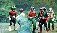 | これぐらい巨大! しかし、弱点である右足の裏をスカイライダーにボウガンで射抜かれ、ひるんだところを7人のライダーキックが炸裂! 遂に倒されます。 |