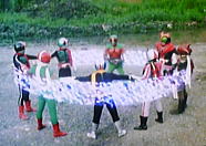 | ヤケクソ気味に『酸素破壊爆弾』と共に東京上空での自爆を謀る大首領でしたが、8人ライダーのエネルギーを結集させたセイリングジャンプによって―― |
