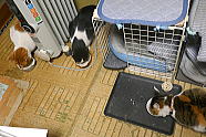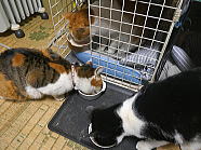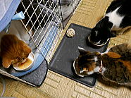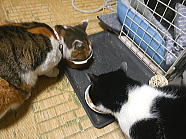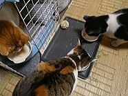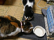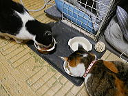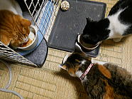 | 7時38分、ミィミィとチャーとコロの朝ごはんタイムです。 |