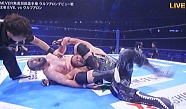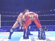 | ツームストン・パイルドライバー、レインメーカー、そして逆エビ固め。オカダ選手の猛攻を凌ぐ棚橋選手。 |