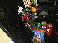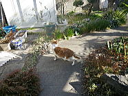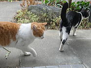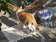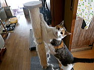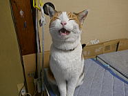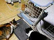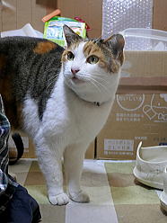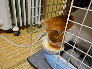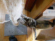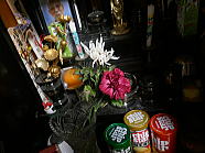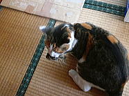 | 猫たちが食事が終えた後、仏花の水を換えました。 |