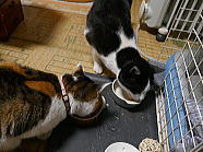 | 6時24分、ミィミィとコロの朝ごはんタイムです。 |