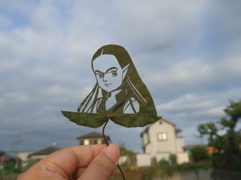 ●『聖戦士ダンバイン』に登場するキーン・キッスの葉っぱアートです。 (UP-DATE:2025.10.11) 前髪が無いキャラクターなので眉、目の繋ぎには苦心しています。 キーンの声はTV版では高田由美さんが、総集編では木藤聡子さんが演じられています。 今回使用したのは、実家の近所で採取した蔦の葉を、5日間グリセリン水溶液に浸け、 5日間 押し葉にしたものです。 このページの先頭へ