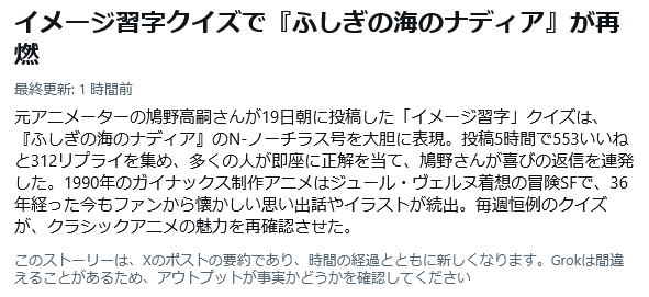 ●X (旧Twitter) の検索『おすすめ』の見出しです。(2026/01/19 18:45撮影) 『イメージ習字クイズ』にアップした『ふしぎの海のナディア』がX (旧Twitter) でトレンド入りをしました。