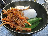 | 朝食 兼 昼食は、筑前煮を煮詰めて味を調整した物とおせちです。ご馳走様でした。 |