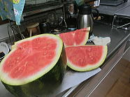 日本のスイカは皮近くまで味がしますが、このスイカは赤い部分しか味がしません。日本式の切り方は向かず 赤い部分をサイコロ状よりも薄くして食べるのが正解のようです。 |