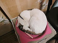 | ピンクの猫盆は大人気で、今日はチャーが寝床としていました。おやすみなさい。 |