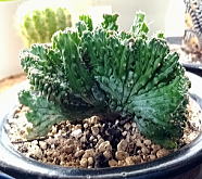 右の写真はユーフォルビア・エノプラ綴化です。内側に丸まっていましたが、太陽の向きを調整して、開くようにしてみました。 |