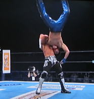 天山選手の新技・真モンゴリアンチョップが高橋選手に炸裂! |