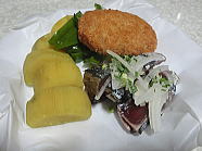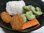 朝食は芋ごはん・カレーコロッケ丼です。ごはん以上に茹でたキャベツが敷き詰められています。
