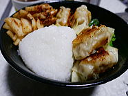 | 朝食は餃子丼です。茹で人参&キャベツが付け合わせ。 ご馳走様でした。 |