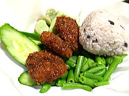 | 朝食は、ハムと鮭フレーク丼です。キュウリと茹で空豆 (冷凍) が付け合わせ。ご馳走様でした。 |