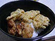 | 晩ごはんはチーズ入りササミカツ (冷凍食品) 丼です。茹でたピーマンと人参が付け合わせ。ご馳走様でした。 |