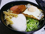 | 昼食は、焼き鮭丼です。目玉焼きと茹でた粒コーンが付け合わせ。ご馳走様でした。 |