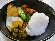 | 朝食は、イカ天 (冷凍食品) 丼です。茹でたキャベツと目玉焼きと高菜、丸大ハンバーグ1/2個が付け合わせ。ご馳走様でした。 |