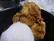 | 夕食は鶏天 (冷凍食品) 丼。目玉焼きと茹でた人参&ピーマンが付け合わせです。ご馳走様でした。 |
