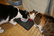 | 朝ごはん中のミィミィとコロです。今朝食べているのは、『CIAOちゅ~るスープ』のとりささみ&しらすです。 |