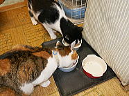 | ミィミィとチャーとコロの朝ごはん光景です。 |