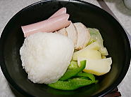 朝食はサラダチキン丼です。 魚肉ソーセージと茹でたピーマン&ジャガイモ&レタスが付け合わせ。