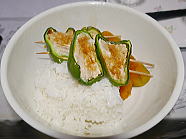 | 夕食はピーマンの肉詰め・蒲焼仕立て丼です。南瓜の煮物が付け合わせ。ご馳走様でした。 |