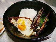 | 朝食は焼きシシャモ丼です。目玉焼きと茹でホウレン草 (冷凍) &ジャガイモが付け合わせ。ご馳走様でした。 |