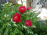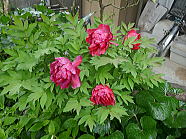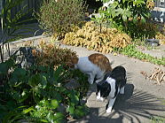 | 食後に仲良く庭に繰り出したミィミィとチャーとコロ。 |