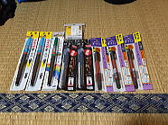 | 16時01分、帰宅。今日買った筆ペンたちを並べました。 |