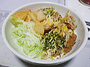 | 20時23分、晩ごはんは天麩羅 (野菜と煮干しと青汁粉) &鶏肉揚げの盛り合わせ丼です。ご馳走様でした。 |