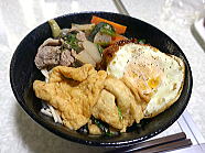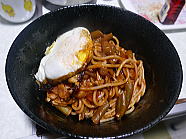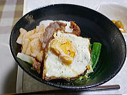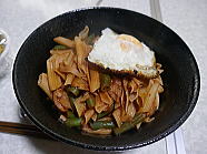 | 13時19分、昼食は肉炒め丼・目玉焼き乗せです。茹でキャベツ&オクラ、大根の唐辛子漬けが付け合わせ。ご馳走様でした。 |