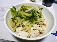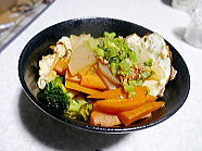 | 嵩増し用の豆腐、白菜、ブロッコリーの入った丼の中へぶち込んで‥‥ |