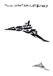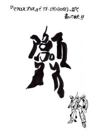 | イメージ習字は『マクロスプラス』 (シルエットモチーフはYF-19) のバトロイド形態と―― |