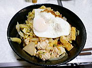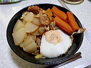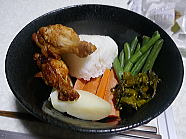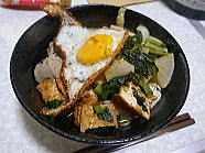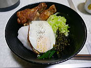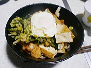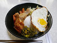 13時20分、昼食は鶏の手羽肉煮丼・目玉焼き乗せで、茹でたオクラ&キャベツ、高菜漬けが付け合わせ。