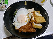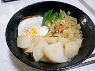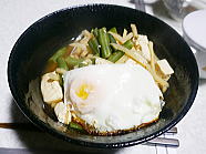 | 19時38分、晩ごはんは筍の千切り入りうどん・目玉焼き乗せです。ご馳走様でした。 |