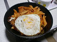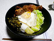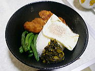 | 13時06分、昼食はコロッケ (冷凍食品) 丼です。茹でた鞘隠元 (冷凍) と目玉焼き、高菜漬けが付け合わせ。ご馳走様でした。 |