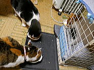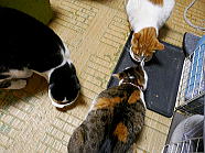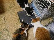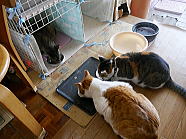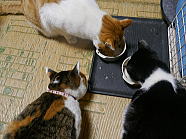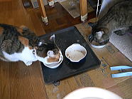 | ミィミィとチャーとコロの朝ごはん光景です。 |