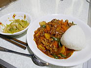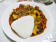 | 14時09分、昼食はポークカレーライスです。唐辛子漬け大根が付け合わせ。ご馳走様でした。 |
