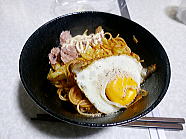 | 19時49分、晩ごはんは中華麺・目玉焼き乗せと―― |