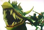 | これぐらい巨大! しかし、弱点である右足の裏をスカイライダーにボウガンで射抜かれ、ひるんだところを7人のライダーキックが炸裂! 遂に倒されます。 |